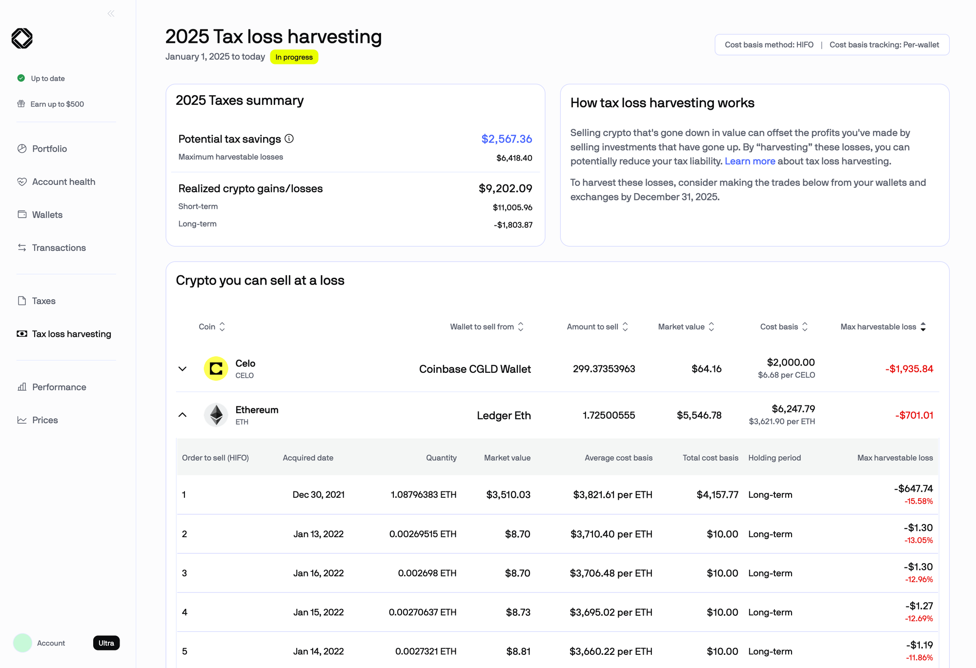 - Identify the crypto assets you hold at a harvestable loss (available on the CoinTracker tax loss harvesting dashboard)